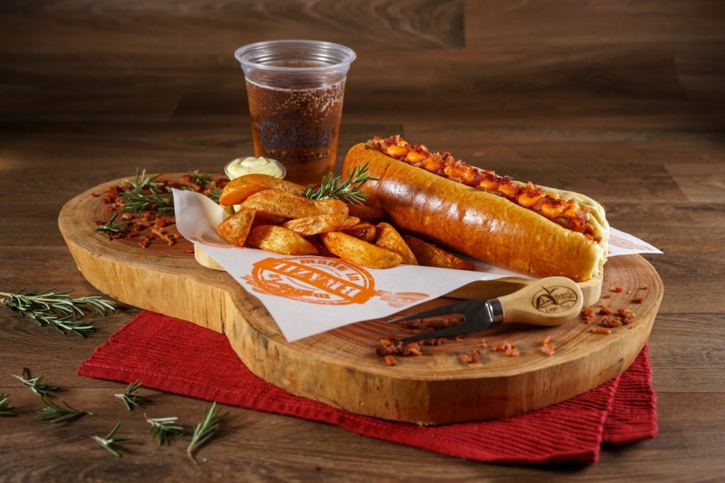 No Geléia no Container, Hot-dog Gourmet (salsicha alemã artesanal, pão brioche especial, maionese caseira, cheddar cremoso e farofa de bacon), acompanhado de batata rústica temperada com páprica sal e alecrim, maionese de alho artesanal e guaraná em lata.