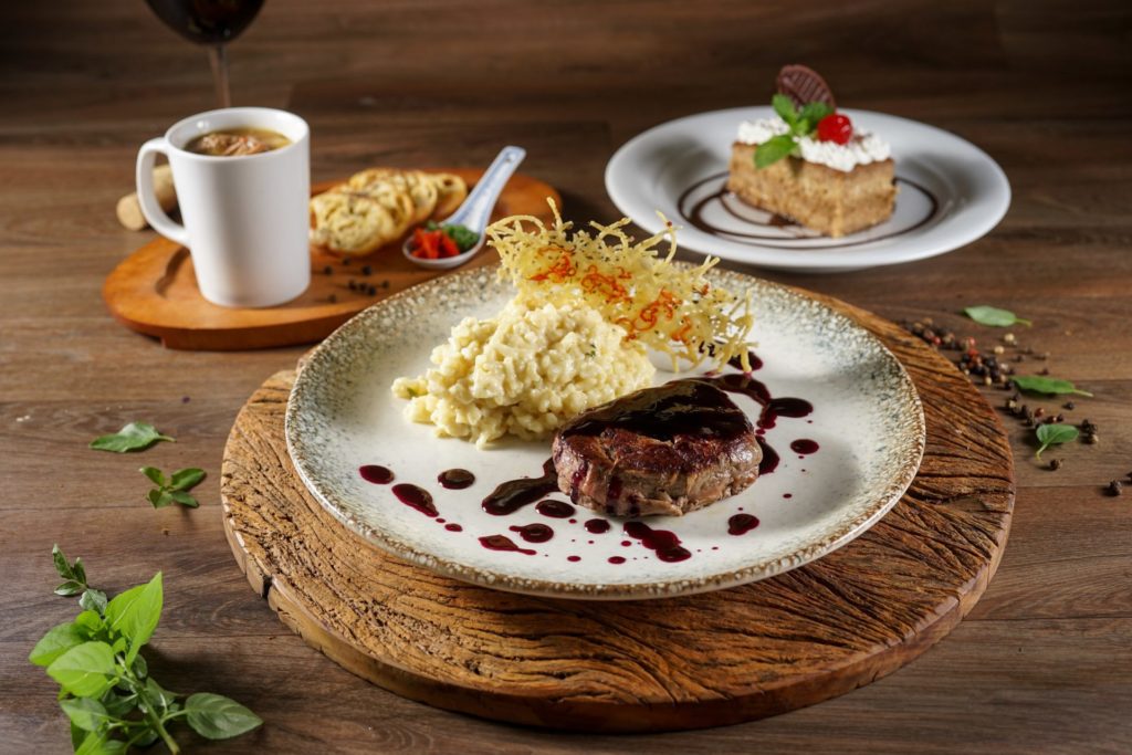O Gran Bier oferece Vaca atolada (entrada), Filé ao molho de Vinho do Porto com risoto de Grana Padano (prato principal) e o Bolo de cappuccino recheado com doce de leite caseiro e brigadeiro gourmet (sobremesa) por R$ 79,00.