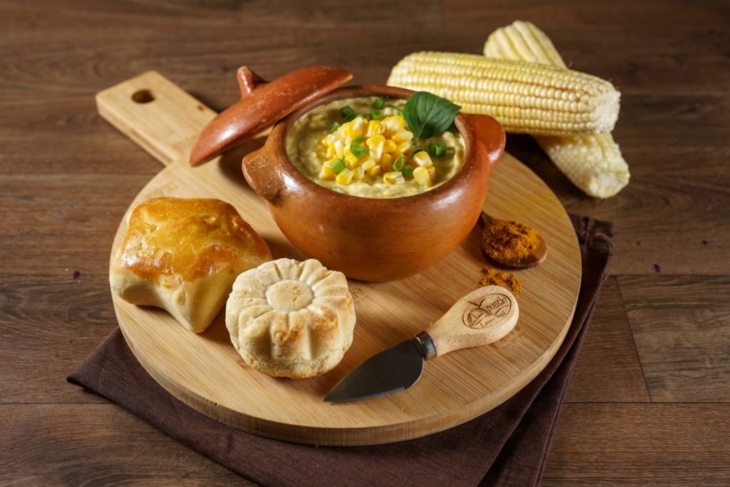 No Kioskids Food & Fun, Creminho de milho com frango desfiado temperado ao curry, acompanhado de pãezinhos fofinhos da casa.
