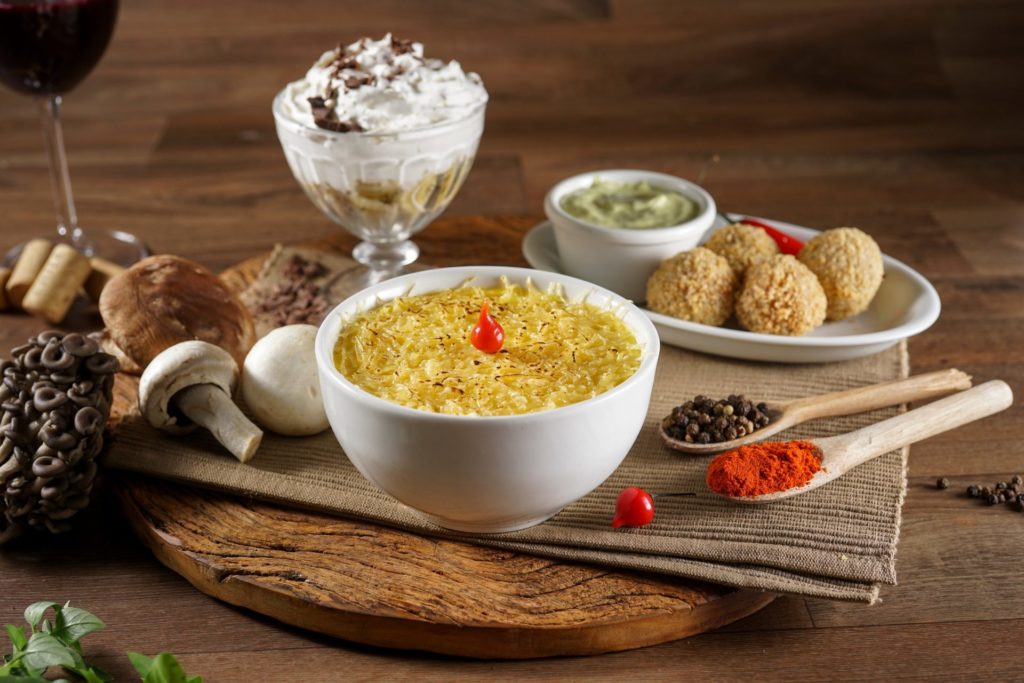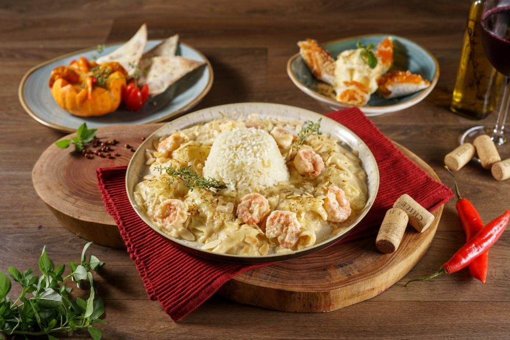 O Manzuá (R$ 89,00) apresenta Caldo de Camarão servido em mini abóbora e focaccia (entrada), Camarões flambados ao molho de queijo brie gratinado com maçã (principal) e Tapioca recheada com doce de abóbora e sorvete de coco (sobremesa).