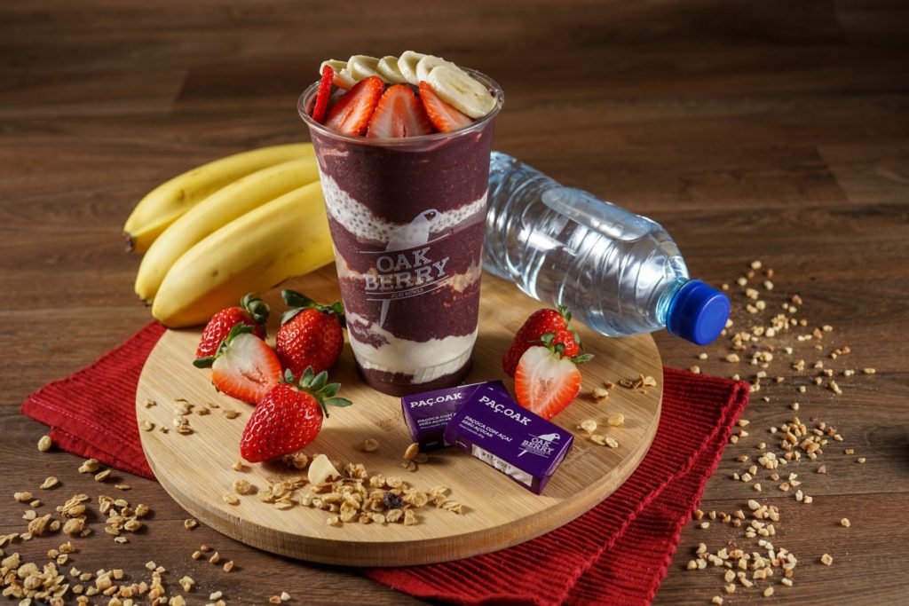 No OakBerry Açaí Bowls, The Oak (720ml), acompanhado de água e duas PaçOak (paçoca com açaí 20g).