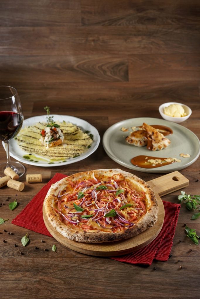 No Wine Garden (R$ 79,00), traz Bruschetta de cogumelos (entrada), Pizza de queijo Emmental, mortadela e raspas de limão-siciliano (principal), e Calzone de caramelo salgado com sorvete de tapioca (sobremesa).