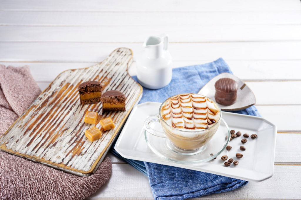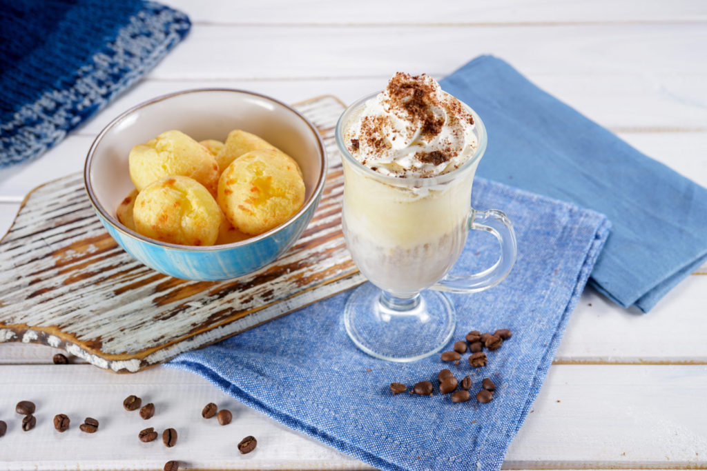 Capuccino cremoso acompanhado de 2 minis pães de mel. R$ 29,00.