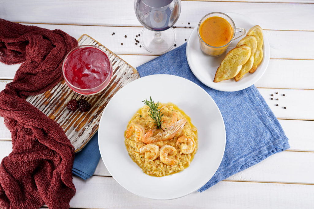 Entrada: Caldo de sururu. Principal: Risoto de Camarão. Sobremesa: Mousse de abacaxi com calda de frutas vermelhas. R$ 99,00.