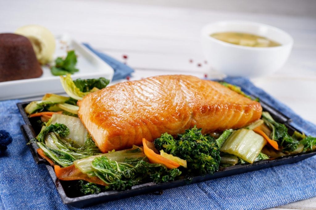 Entrada: Missoshiro. Principal: Teppan de Salmão. Sobremesa: Petit gateau. R$ 99,00.