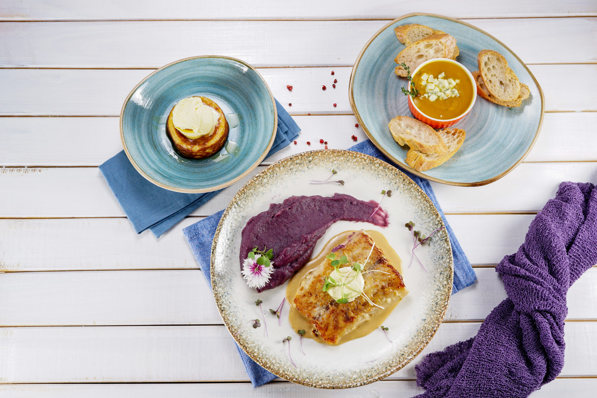 Entrada: Caldinho de abóbora com queijo gorgonzola. Principal: Filé de robalo ao molho de champanhe purê de batata roxa e manteiga de laranja. Sobremesa: Cocada de forno com sorvete de tapioca. R$ 89,00.
