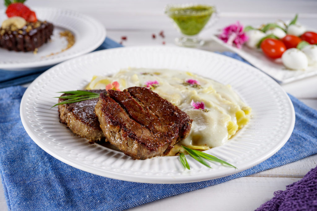 Pesto. Principal: Ravioli recheado de pera com baru e grana padano servido ao molho gorgonzola. Acompanha filé mignon. Sobremesa: Brownie de chocolate servido com calda quente de chocolate meio amargo finalizado com castanha. R$ 99,00.