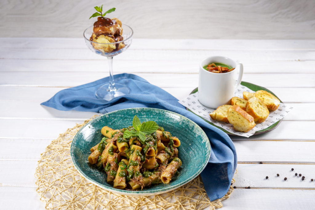 Entrada: Creme de ervilhas com bacon. Principal: Rigatoni com ragu de cordeiro e chimichurri de hortelã. Sobremesa: Profiteroles com calda quente de chocolate. R$ 89,00.