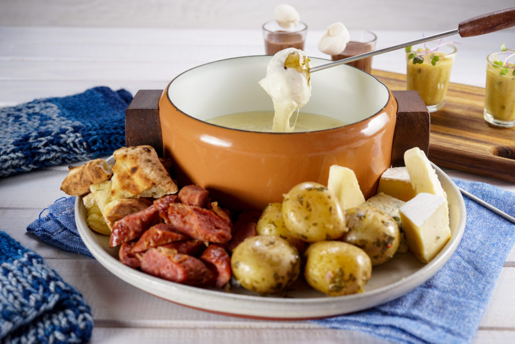 Entrada: Amuse bouche de batata baroa com frango. Principal: Fondue de queijo (com focaccia Rosemary, batata bolinha, linguiça e queijo). Sobremesa: Chocolate quente com marshmallow baby. R$ 99,00.