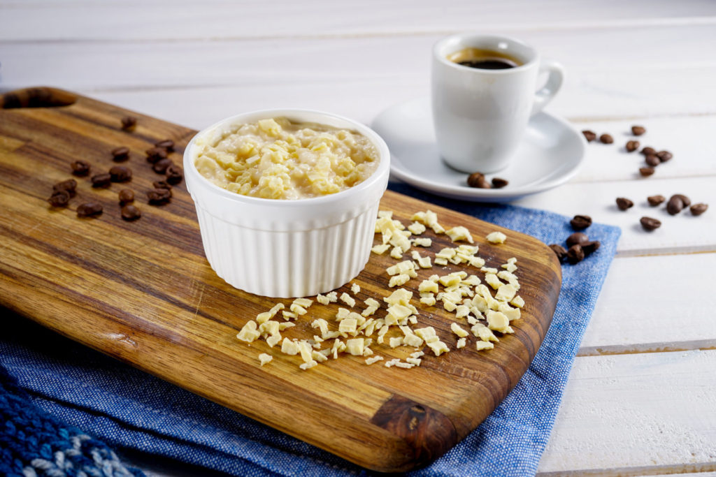 Arroz doce com chocolate branco e café expresso. R$ 29,00.