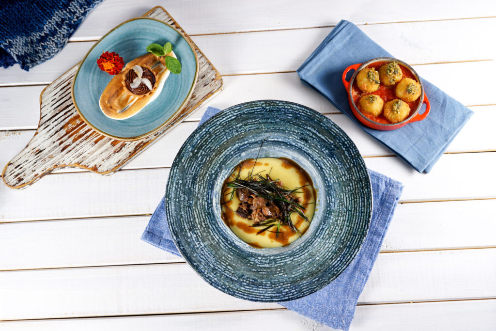 Entrada: Panelinha Mozzarella. Cinco bolinhas de Mozzarella, molho de tomate e pesto. Principal: Ossobuco desfiado na cama de polenta cremosa e crispy de couve. Sobremesa: Profiteroles com calda quente de chocolate e lichia e marshmallow derretido. R$ 89,00.