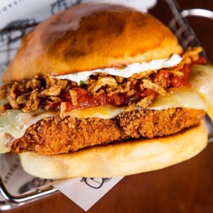 O Georgia traz uma proposta diferente do tradicional hambúrguer de frango. O novo burger da rede é preparado em um pão de cebola, leva uma deliciosa e suculenta sobrecoxa de frango empanada, molho rústico de tomate, queijo branco, cebola crispy e sour cream. A delícia sai por R$ 29,90.