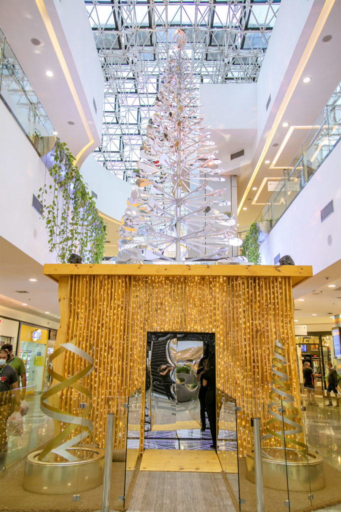 Feita de metal e ferro obtidos de maneira sustentável, a árvore de natal mantém seu tradicional formato cônico. Os espelhos instalados na estrutura refletem o canhão de luzes que estão instalados por toda a praça do shopping, fazendo com que o público interaja com o projeto, gerando movimento.