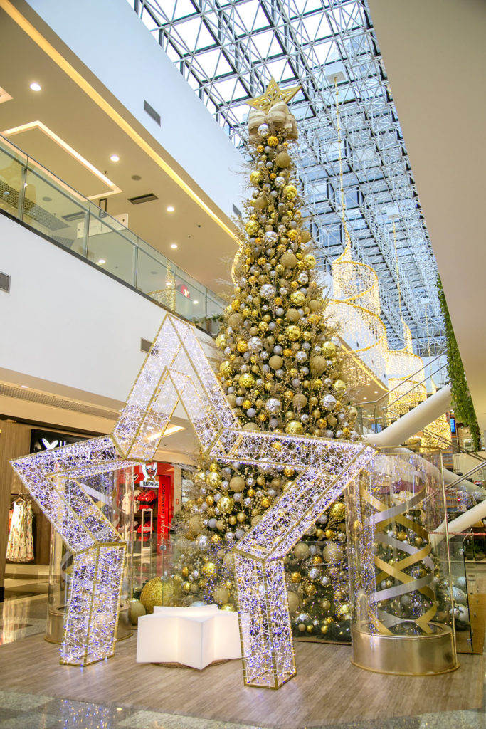Assinada novamente pela Cipolatti em parceria com o artista Marcos Pacheco, a decoração de natal aposta forte na iluminação e nos tons de dourado para colorir com sofisticação o interior e exterior do mall. A fachada exterior do shopping recebeu iluminação de led em tons brancos, juntamente com estrelas douradas de diferentes tamanhos, que agora compõem com graça a decoração externa. À noite, se iluminam em tons de dourado e viram o cenário perfeito para muitas fotos.