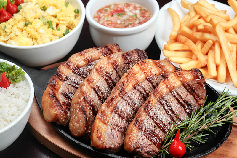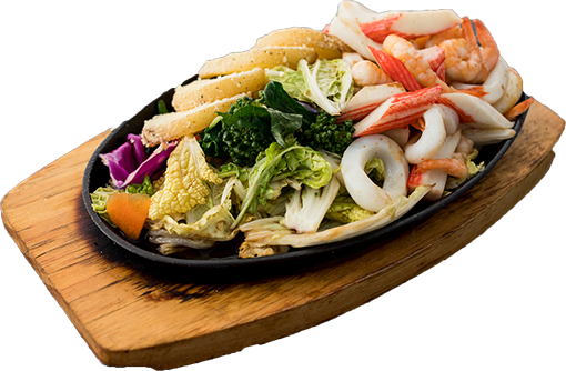 Teppanyaki filé, Teppanyaki frango, Teppanyaki salmão e Teppanyaki de frutos do mar. Todas as opções são compostas pelo grelhado acompanhado de legumes passados na manteiga e batatas crocantes ao alho.