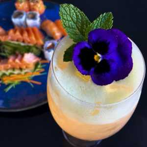 Sugoi Mule (saquê, vodca, purê de pera, calda de chá verde, limão e espuma de gengibre)