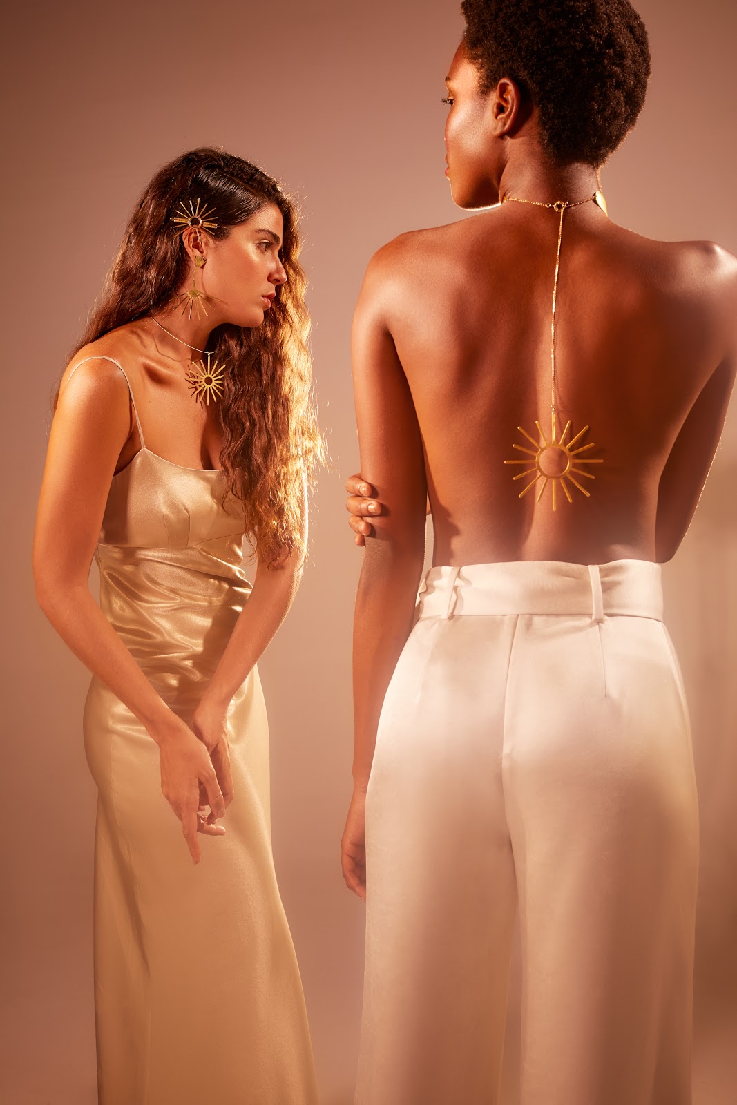 Conhecida pelo maximalismo, Nathália se desafia como designer e cria peças que tem o metal como único material. A variedade de cor das coleções passadas, característica forte da marca, é substituída pelo metal em sua forma mais pura, garantindo um aspecto ‘cru’. A escolha tem uma motivação: a Abi quer inspirar todas as mulheres a buscar e entender suas essências. O Sol aparece de forma não literal graças aos grafismos das peças.