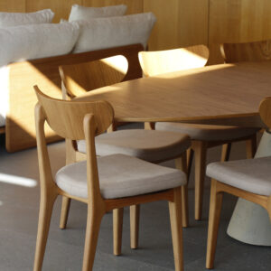Para dar forma a essa ambientação, a Acervo recorreu a uma parceria de longa data com o Grupo Arte Nova, trazendo especialmente para o projeto peças da marca Domum – uma linha mais clássica, confortável e madura, que dialoga com a elegância proposta pela arquitetura da casa. “A Domum traz esse tom mais tradicional e acolhedor, que combina perfeitamente com o estilo da casa. É uma marca que imprime personalidade e sofisticação”, destaca a curadoria da loja.
