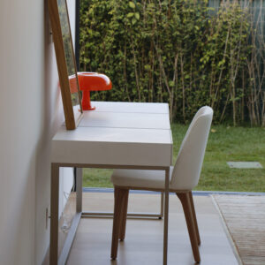 Pensada desde o início para ser colocada à venda, o espaço foi projetada para ir além da simples exibição de metros quadrados. A proposta foi transformar o espaço em uma casa humanizada, funcional e acolhedora – pronta para ser habitada e sentida. Para isso, a Acervo Mobília foi convidada a ambientar os ambientes com peças selecionadas, criando uma narrativa visual que valoriza cada detalhe do projeto.