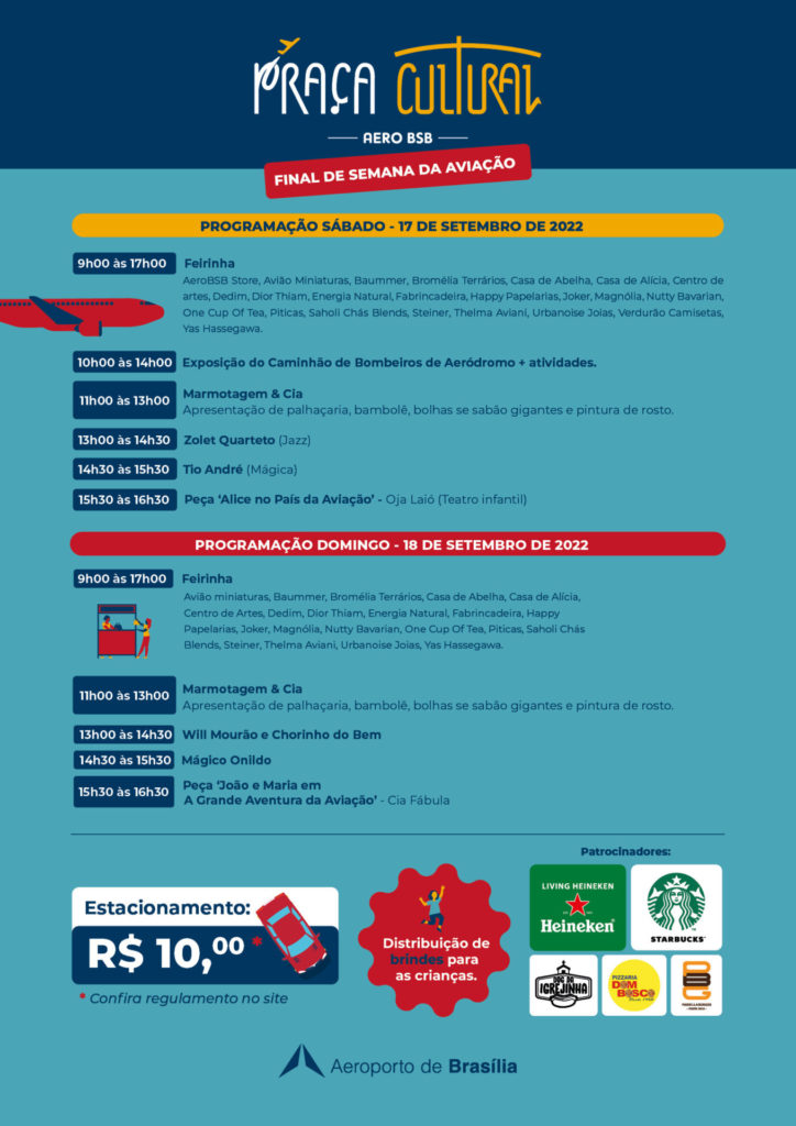 Sábado e domingo são dias para curtir com a família. Por isso, no final de semana do dia 17 e 18 de setembro o Aeroporto de Brasília vai promover um final de semana da aviação. Um evento gratuito para todas as idades. A primeira edição da Praça Cultural promoverá dois dias com diversas atrações como músicas ao vivo, peças infantis com tema de aviação, feirinha, exposição do caminhão dos bombeiros de aeródromo, distribuição de brindes e comidas para todos os gostos. O evento acontecerá na Praça Pick Up, área localizada em frente ao terminal aéreo, das 9h às 17h. O espaço também conta com parquinho para os pequenos. Todas as atrações culturais são gratuitas.