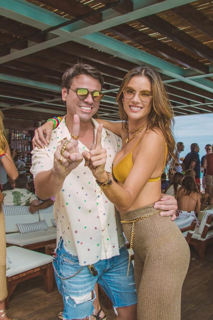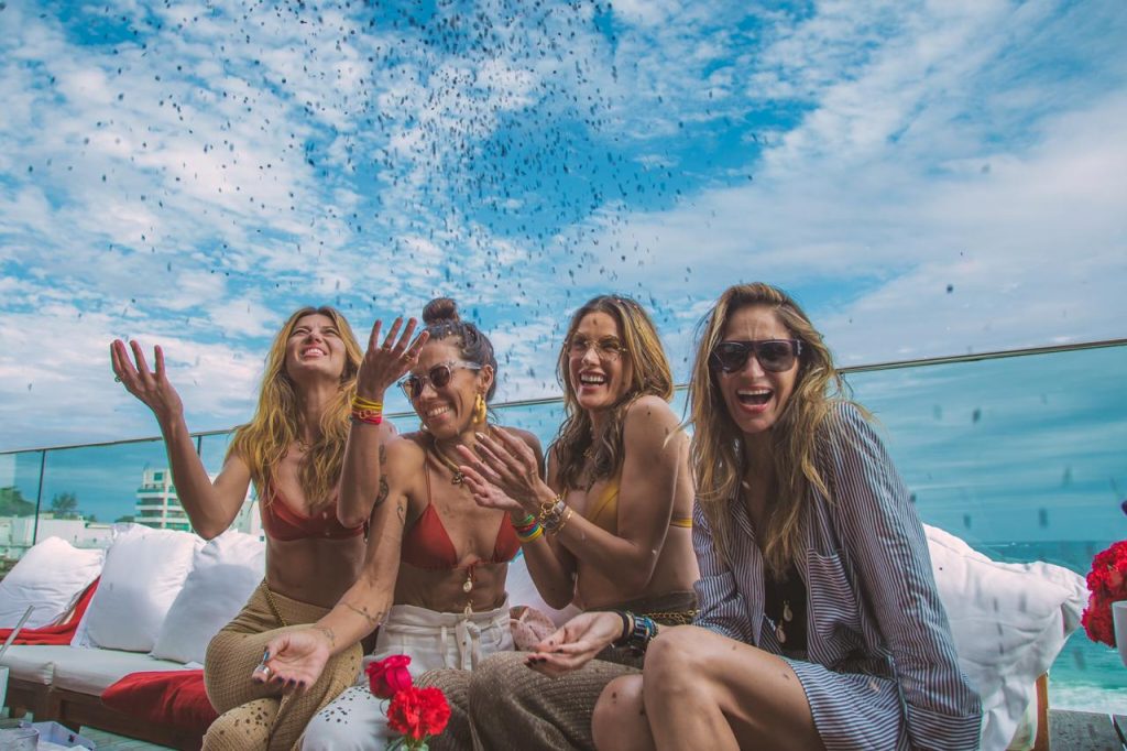 Embaixadora da #togetherband, campanha que promove os 17 Objetivos de Desenvolvimento Sustentável da ONU, Alessandra distribuiu pulseiras azuis representando a ODS 14, proteger a vida marítima, junto com kits personalizados em caixas “RIO we GAL” com biquínis escolhidos a dedo para cada amiga, além de body oil sustentável Costa Brazil e make up Charlotte Tilbury.