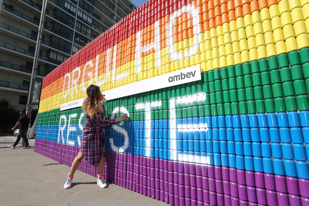 O movimento #OrgulhoResiste, lançado pela Ambev no mês do orgulho LGBTQIA+, coloriu pontos emblemáticos de São Paulo neste final de semana. Um mural móvel, produzido com três mil latas de alumínio e pintado com as cores da bandeira que representam a comunidade, estará no dia 26 na Praça do Ciclista, região da Avenida Paulista, e nas Praças Roosevelt e Ramos Azevedo, nos dias 27 e 28, ambas na região central da capital paulista.