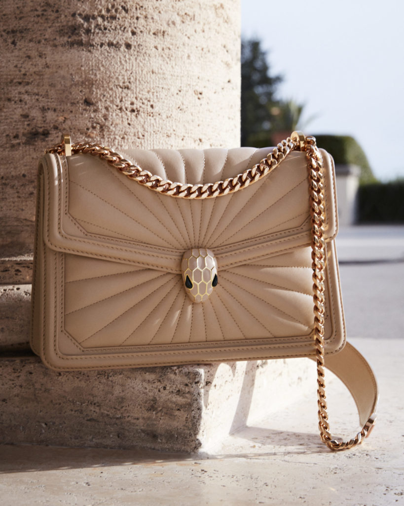 Nuances quentes e atualizações ousadas de algumas das bolsas mais icônicas da Bvlgari marcam o segundo mood da Coleção, chamada SUNSHINE. Aqui cativantes e alegres padrões radiais tomam forma em encantadores novos motivos, como o do Serpenti Diamond Blast Sunshine Quited, enquanto nuances reconfortantes infundem os estilos mais emblemáticos da estação com o calor da luz de Roma.