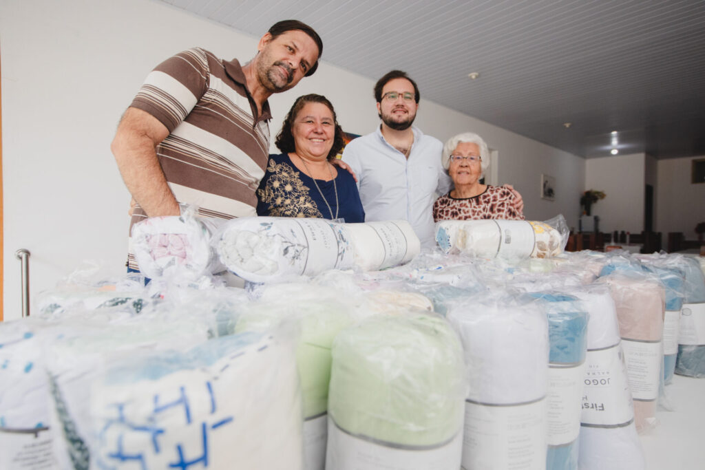 Antonio Aversa e Railda Costa fazem a entrega de roupas de cama para o Instituto ARCA