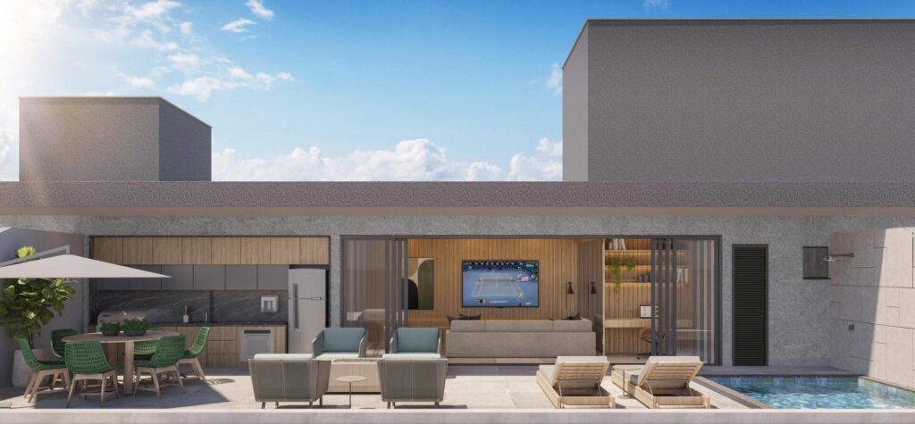 Mas a inovação não é apenas na área privativa, as áreas comuns também foram estrategicamente pensadas para oferecer momentos inesquecíveis. Destacando-se uma churrasqueira com piscina exclusiva, que vai proporcionar a todos os moradores desfrutar da experiência de ter uma cobertura por um dia para receber e celebrar entre amigos e familiares.