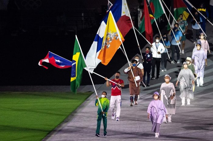 No desfile das delegações, o Brasil foi representado por Rebeca Andrade, da ginástica artística, como porta-bandeira. Assim como na cerimônia de abertura, o Japão preferiu seguir o ordenamento alfabético japonês, onde as vogais vêm antes das consoantes, o que fez com que o Burajiru, como o Brasil é chamado no alfabeto katakana, fosse apenas a 151ª nação a entrar no local. Aos poucos, outros integrantes da delegação brasileira juntaram-se a medalhista de ouro e prata, caso do boxeador Hebert Conceição, ouro na categoria até 75kg.