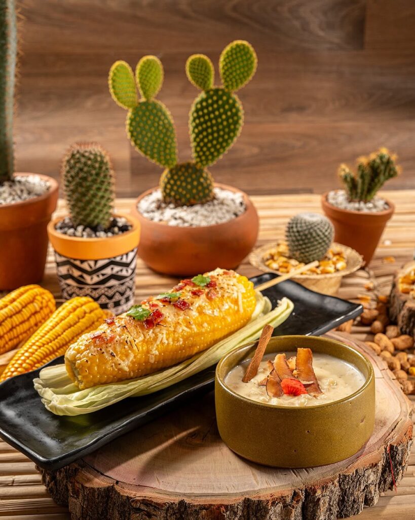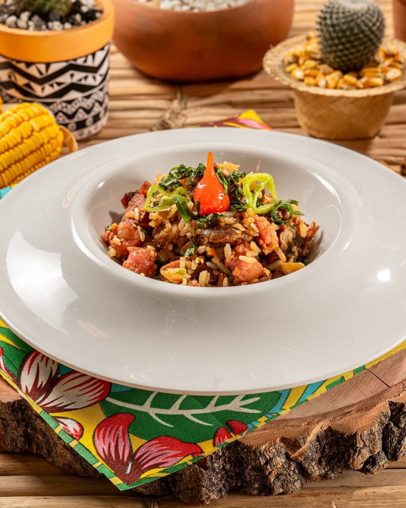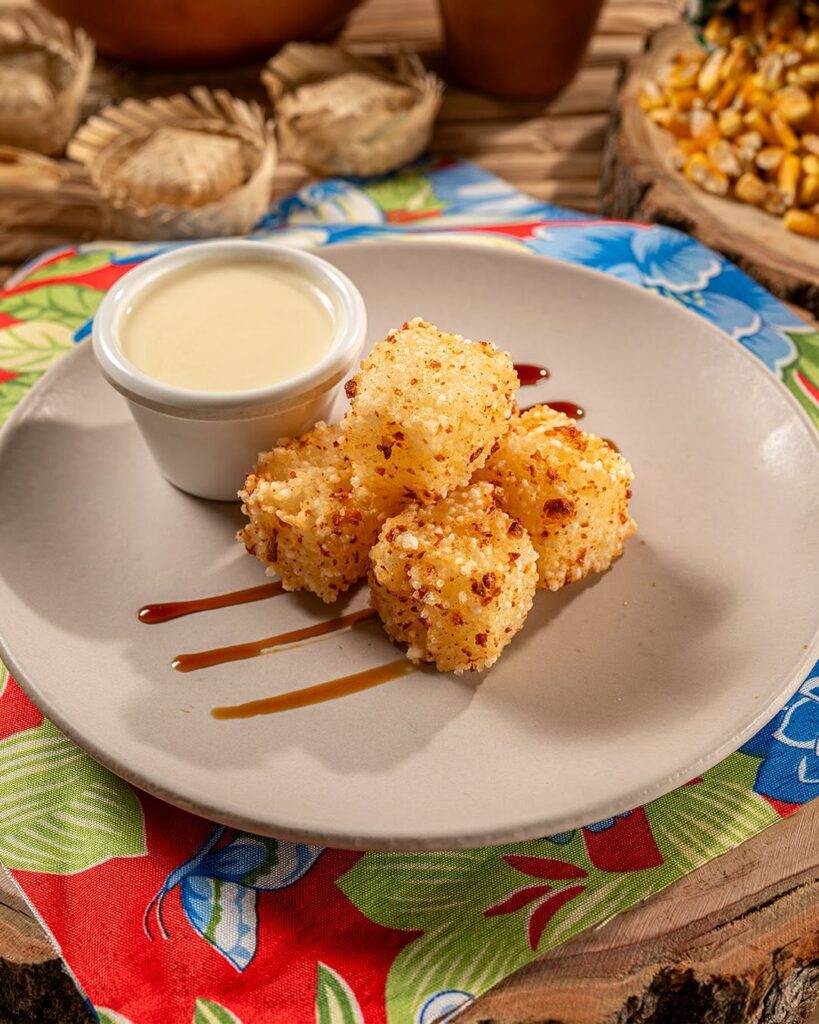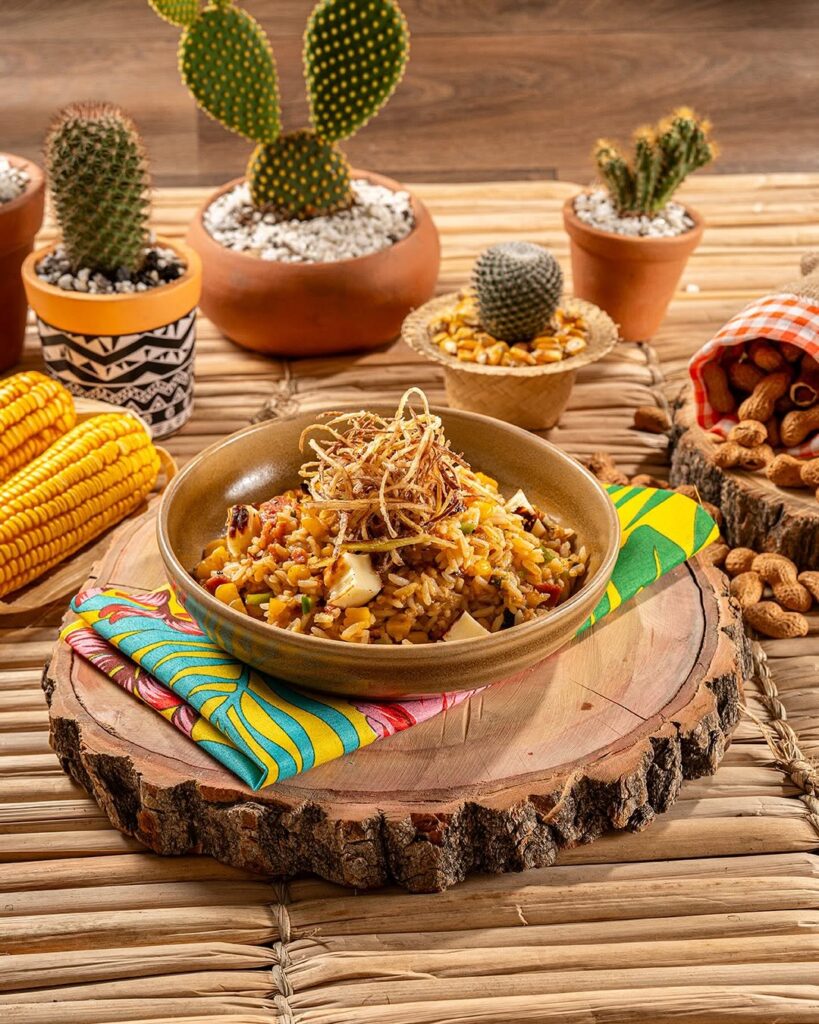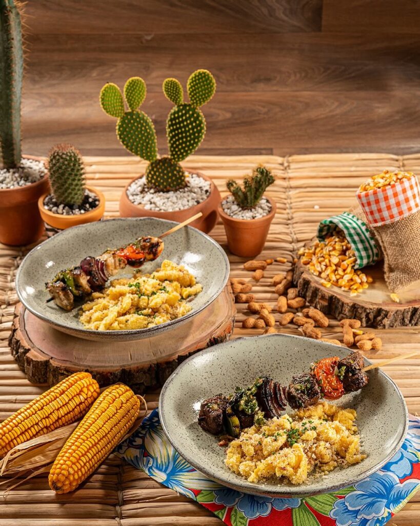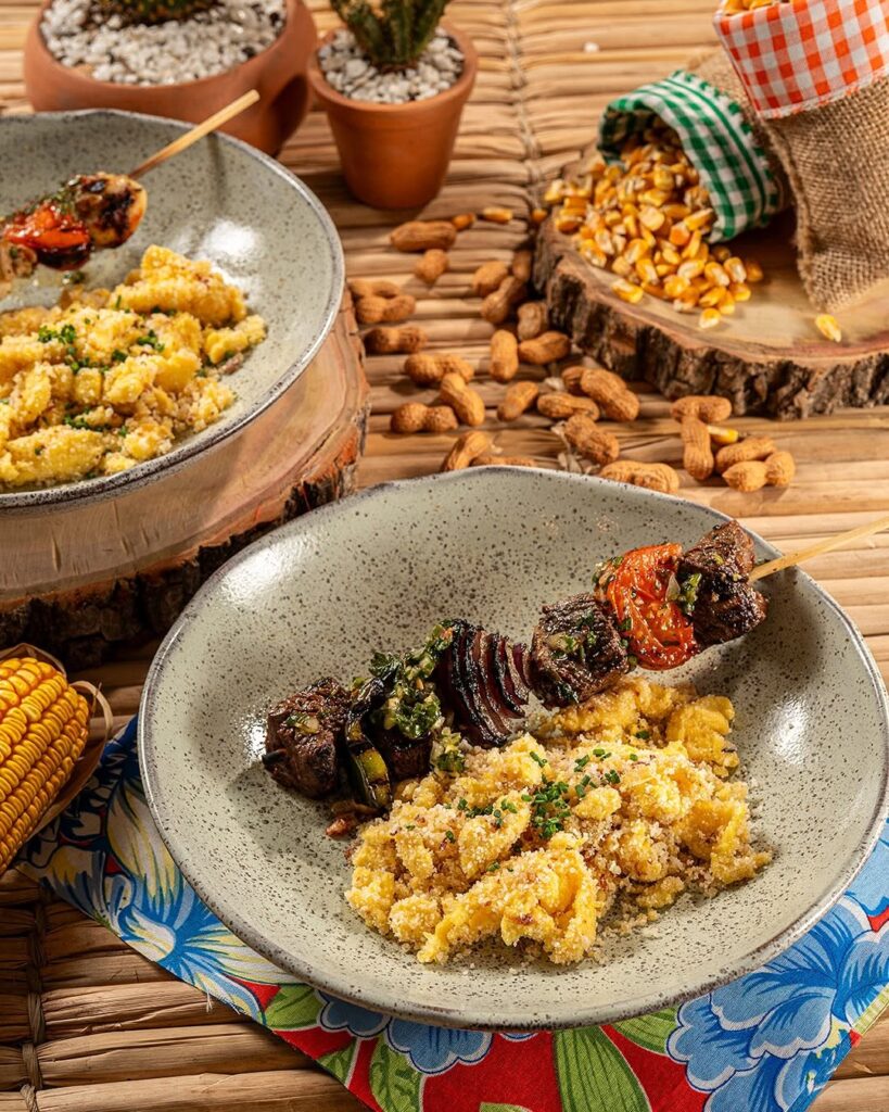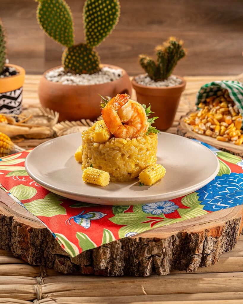 Dadinhos da roça (delicados cubos de tapioca crocante por fora e macios por dentro, servidos com um cremoso queijo quente e finalizados com melaço de cana artesanal. Uma combinação que resgata doçura e o aconchego da roça, em uma versão irrestivelmente atual por R$ 30,00 e Risoto Amarelo do Atlântico (risoto cremoso preparado com milho baby defumado, trazendo notas suaves de fumaça e doçura, coroado com camarões grelhados no ponto perfeito. Um encontro harmonioso entre o sabor do campo e a elegância do mar, R$ 30,00.