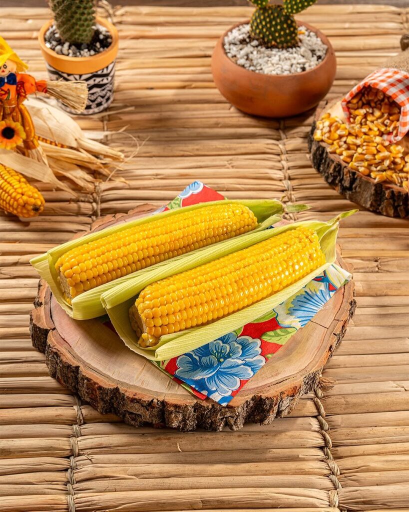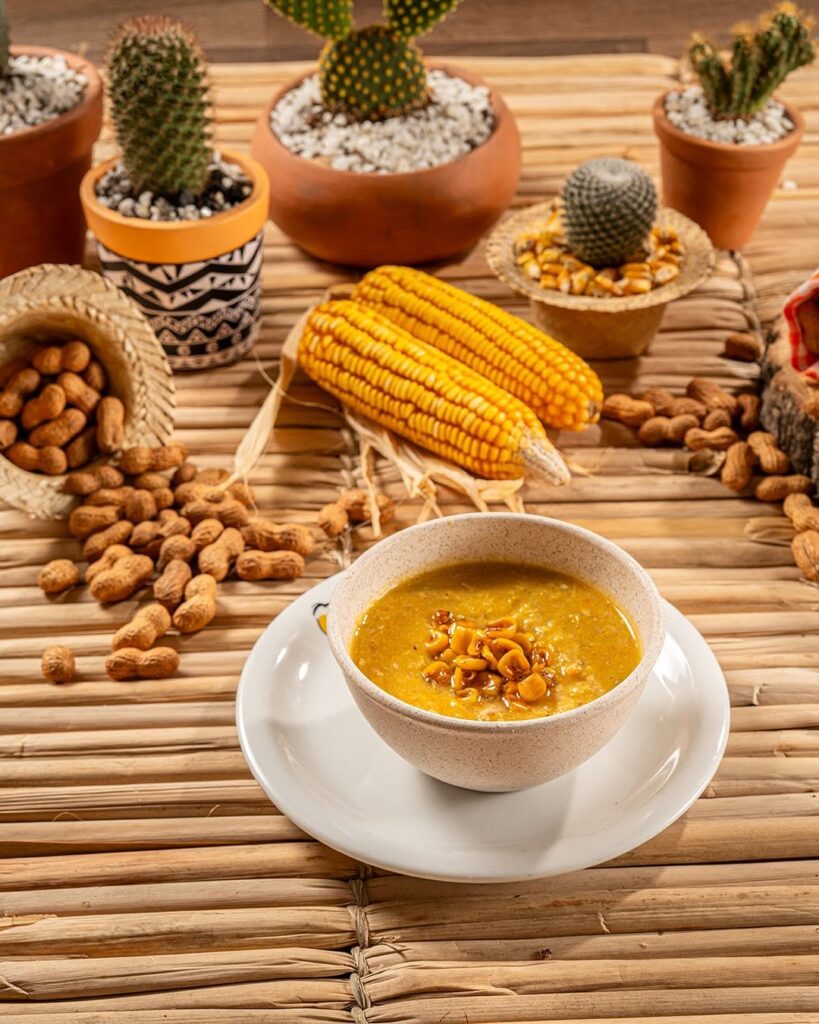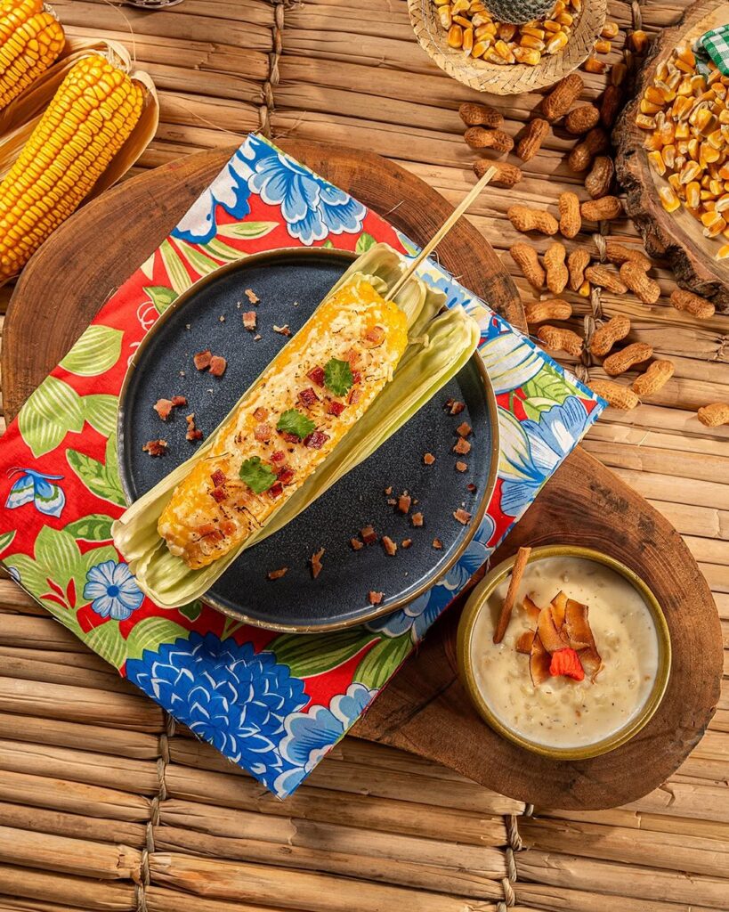 Duas opções juninas: Canjica (R$20,00) e Milho gourmet, com queijo e bacon (R$ 20,00).