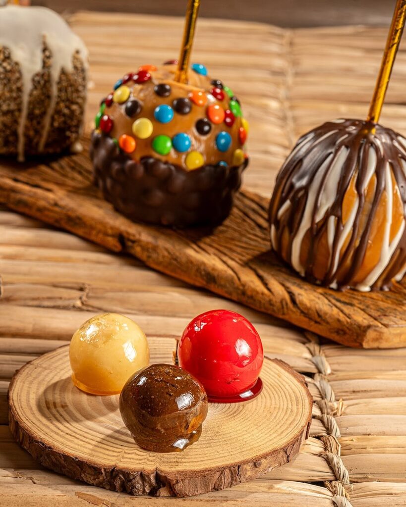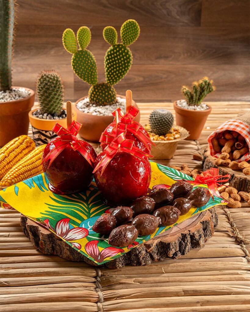 Morango do amor (R$ 24,00), Apple caramelo (R$ 37,00), Bala baiana (R$ 10,00), Chocolate quente (R$ 18,00), Choconhaque (R$ 25,00) e Pão de mel (R$ 18,00).