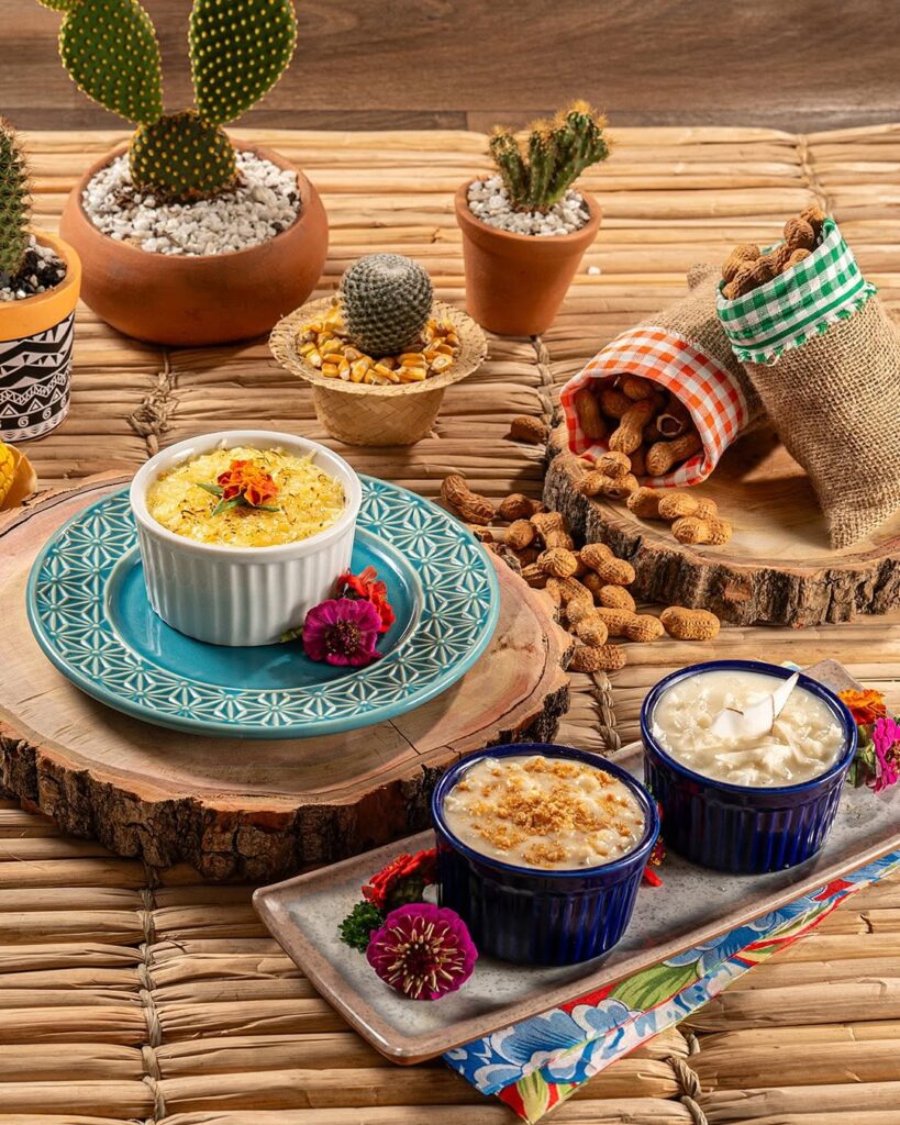 Canjiquinha de leite condensado com coco fresco (R$ 15,00), Canjiquinha de amendoim com pacoquinha (R$ 15,00) e Escondidinho de carne seca com linguiça artesanal (R$ 28,00).