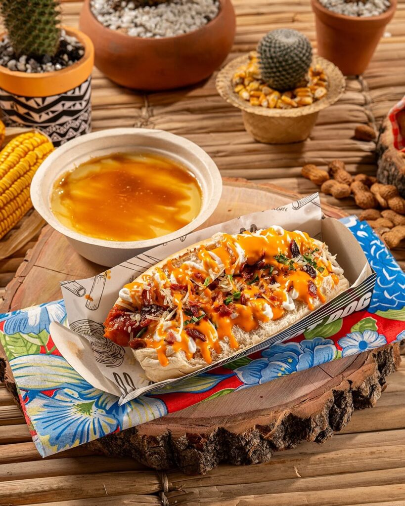 Cachorro-quente artesanal (R$ 30,00) e Curau (R$ 15,00).