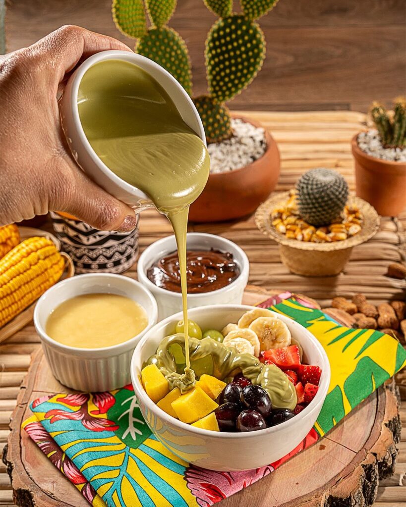 A estrela é o Fondue de chocolate. Com calda de pistache (R$ 30,00) e com calda de chocolate ao leite ou chocolate branco (R$ 30,00).