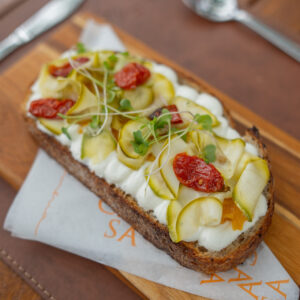 Ainda, Toasts de sabores variados, como Capra (creme de queijo Boursin, geleia de damasco, abobrinha e tomatinhos); Salmão (salmão curado da casa, coalhada síria, avocado laminado, picles de beterraba); Vegan Toast (ragu de cogumelos, homus, tomate cereja, confit e manjericão); Espanhol (jamón, geleia de morango, creme de ricota, morangos frescos e lascas de parmesão); Caprese (muçarela de búfala, tomate fresco e pesto de manjericão); Avotoast (creme de avocado, ovo estalado, bacon e picles de cebola roxa).