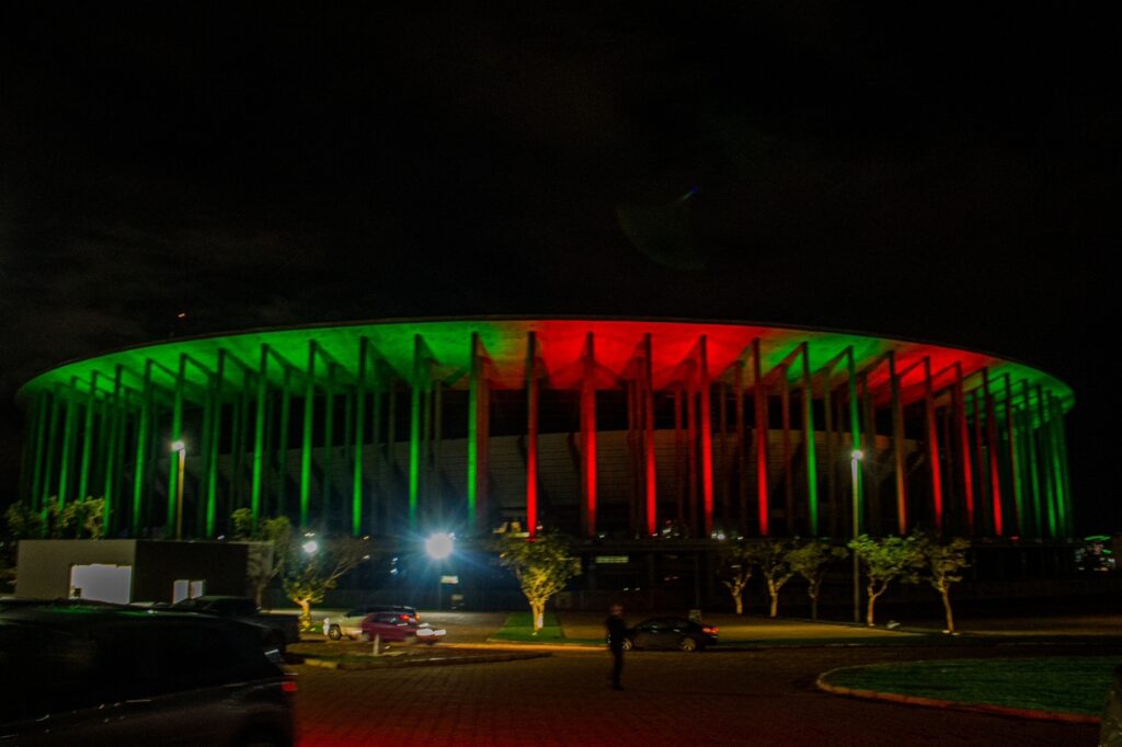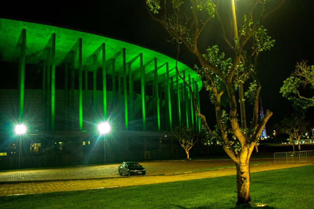 Os 20 mil m² de concreto do maior estádio do país receberam 96 canhões de luzes que podem exibir até 64 milhões de cores sincronizadas com música