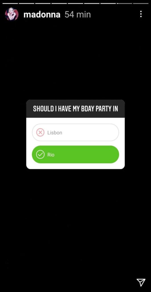 Madonna já está planejando seu aniversário de 63 anos, comemorado no próximo dia 16 de agosto. A rainha do pop fez uma enquete no Instagram e pediu a opinião dos internautas para o local da comemoração especial.