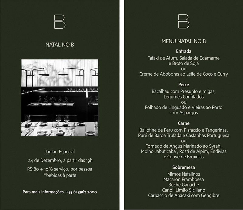 No dia 24 de dezembro, a partir das 19h, o B Hotel Brasília celebra a chegada do Natal com um jantar completo, orquestrado carinhosamente pelo chef Jean Yves. O menu oferece opções de entrada, como o Creme de Aboboras ao Leite de Coco e Curry; peixes, como o tradicional Bacalhau com Presunto, Migas e Legumes Confitados; carnes, como o Bellotine de Peru com Pistaccio e Tangerinas, Puré de Baroa Trufada e Castanhas Portuguesas; e sobremesas, com Mimos Natalinos, Macaron de Framboesa, Canoli Limão Siciliano, entre outras opções. A ceia completa (entrada, peixe, carne e sobremesa) será oferecida pelo valor de R$180 + 10% de serviço, por pessoa. Bebidas são cobradas à parte.