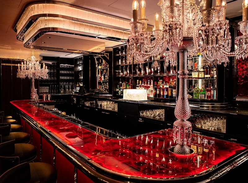 Projetado pela Fabled Studio, os interiores complementam a beleza das criações artesanais da Baccarat. O bar foi projetado com base na ideia de ser um quarto que você encontraria na Maison Baccarat em Paris, pagando homenagem à forma e padrão de algumas das peças mais famosas da marca. As paredes facetadas e os motivos decorativos são misturados com couro tátil e estofamento de veludo no vermelho característico da Baccarat, obtido pela fusão de cristal claro com pó de ouro de 24 kt e azul da meia-noite. O bar é decorado em iluminação de cristal e piso de mármore monocromático.