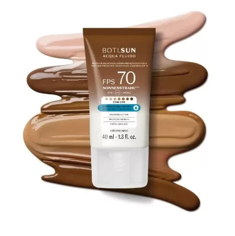 Com 8 tons disponíveis e fórmula fotoestável de proteção imediata e cobertura leve, que não craquela, não derrete e uniformiza o tom. A textura é ultraleve e confortável, hidratando a pele por até 8 horas, mantendo a sensação de pele limpa e suave ao longo do dia. Com a tecnologia de proteção Sonnenstrahl, combina biopeptídeos e potentes filtros solares para entregar alta proteção contra raios UVB, UVA e luz azul.Boti.Sun Cores combina o alto fator de proteção FPS 70a uma cartela diversa com oito tonalidades, atendendo a uma necessidade dos consumidores brasileiros. Pesquisas revelam o comportamento e dores reais destes consumidores, onde 47% relatam que deixaram de usar proteção com cor por dificuldade de achar o tom ideal para a pele.