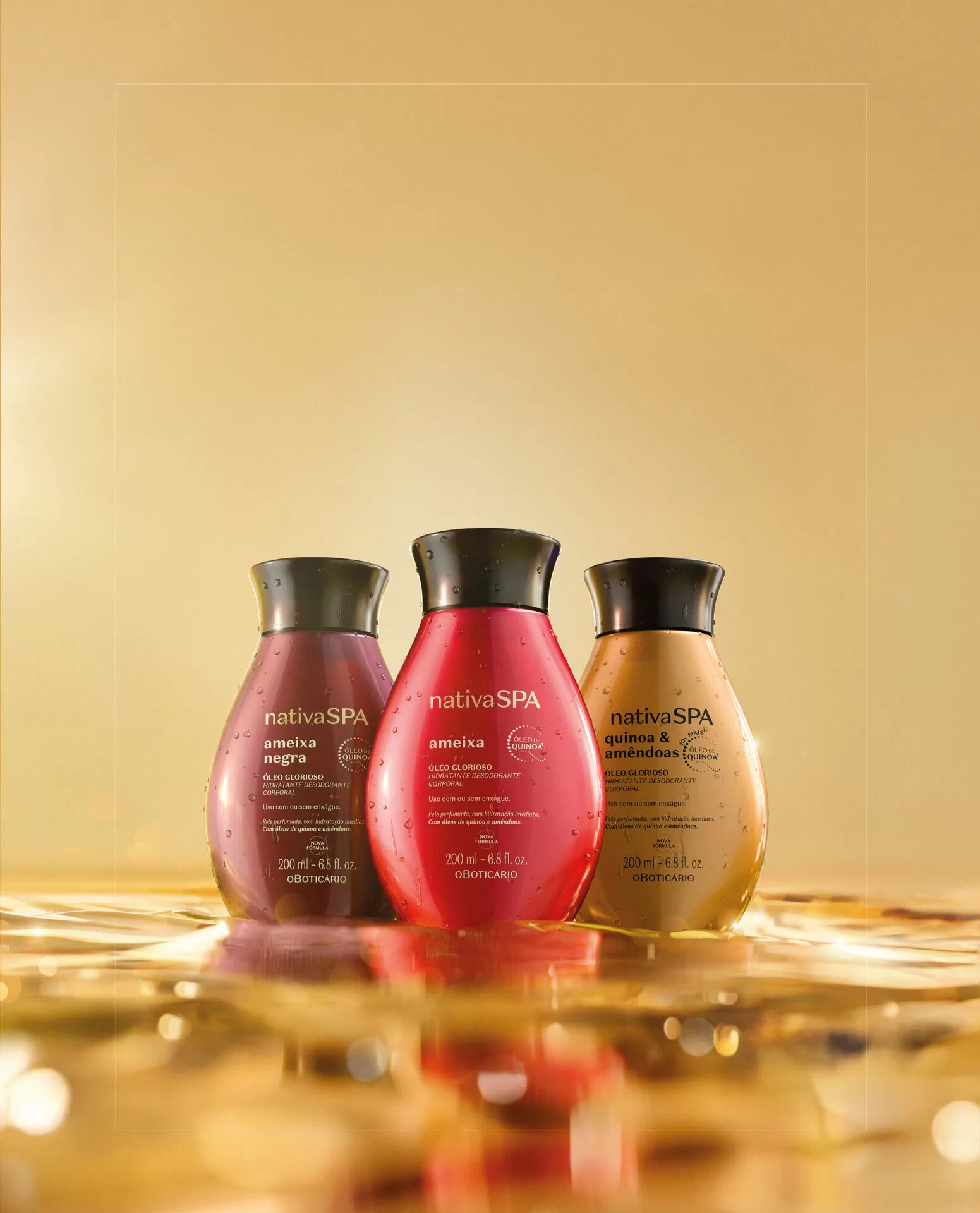 O Boticário apresenta a nova geração dos Óleos Gloriosos de Nativa SPA, agora reformulados para entregar alta performance em perfumação e hidratação. A fórmula inédita combina óleo de amêndoas com o exclusivo bioéster de quinoa, ativo característico da linha, garantindo fragrância intensa mesmo após o banho e nutrição profunda para a pele.