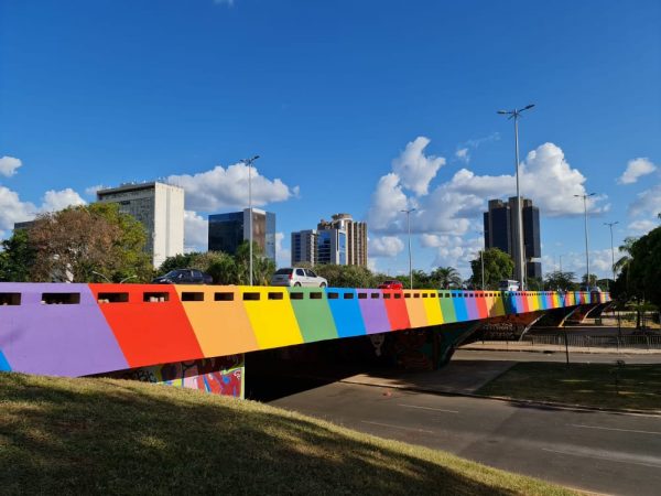 Brasília acaba de receber mais um ponto turístico que traz ao centro da capital as cores do arco-íris LGBT e que leva a todo o país uma mensagem de orgulho e respeito à diversidade. O viaduto da Galeria dos Estados, na Asa Sul, teve os dois lados pintados, somando 460 metros, por uma ação desenvolvida pelo coletivo Brasília Orgulho e da ONG Habra, com apoio da Secretaria de Cultura do DF. Aproximadamente 216 litros de tintas nas cores vemelha, laranja, amarelo, verde, azul e roxo foram usados para tonar o viaduto um local instagramável e mais bonito, se tornando a maior intervenção urbana desse tipo no Brasil.