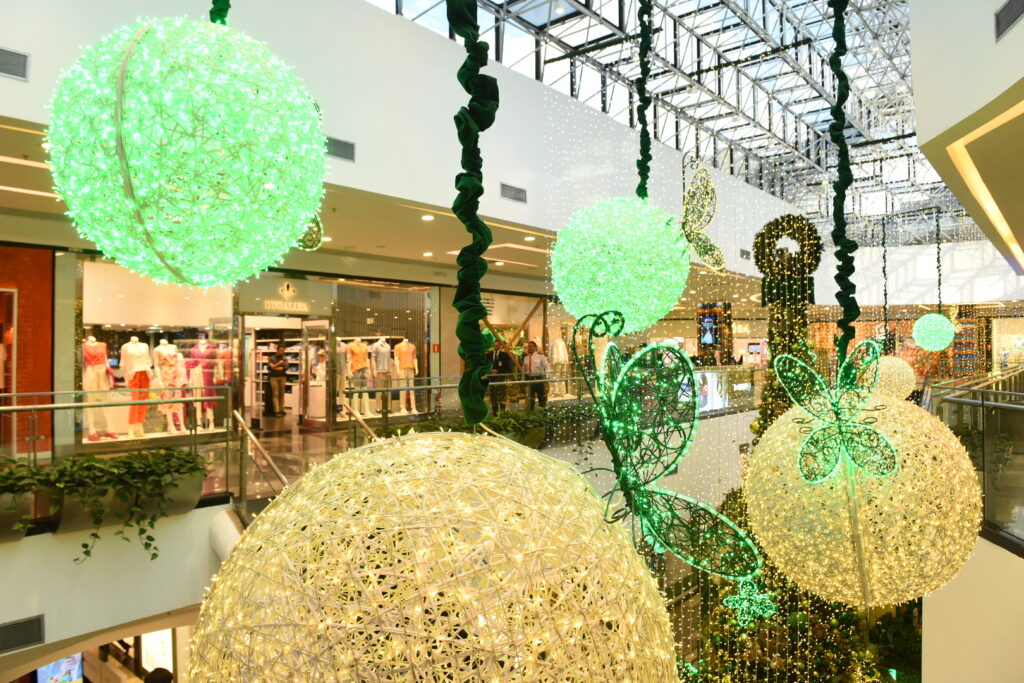 Como um grande lustre, a estrutura pende, majestosa, na Praça Central ao lado de mais de 5 mil leds aéreos colocados nos vãos das cúpulas de vidro. Embaixo, um piso iluminado e um conjunto de pinheiros tradicionais completam o cenário, que lembra um jardim. Na Praça Cúpula Sul, próxima à loja da Hering, está o trono do Papai Noel com uma árvore de Natal de 11 metros e uma casa de árvore com escorregador que cria uma atmosfera aconchegante e lúdica. Além da fachada iluminada, a decoração da área externa também conta com uma novidade: as cúpulas emblemáticas do centro de compras estão revestidas por 200 mil lâmpadas verdes, uma atração à parte.