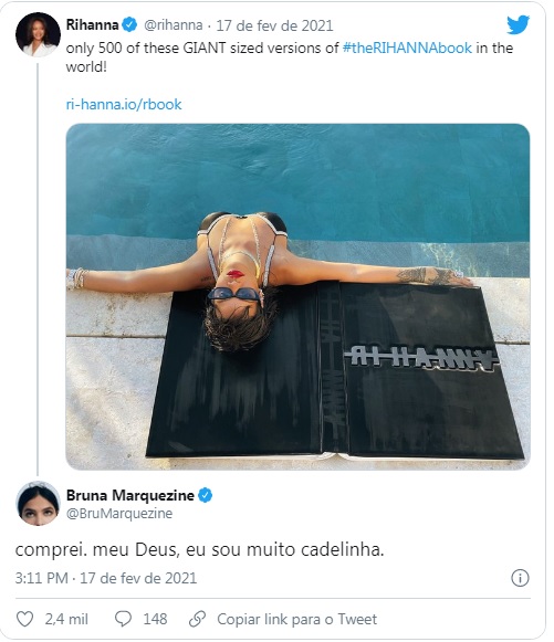A atriz Bruna Marquezine, fã declarada de Rihanna, acaba de fazer um pequeno investimento: o livro com fotos da carreira de Rihanna que custa a partir de 995 libras esterlinas (R$ 7.522) e tem mais de mil imagens da cantora. Além disso, o book é uma edição ‘queen size’, medindo 65 cm de altura, meio metro de comprimento e pesando 27 kg, e apenas 500 cópias foram produzidas no mundo todo.
