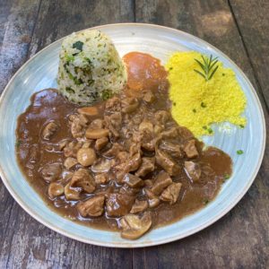 Cubinhos de carne ao molho de vinho, cebolas échalotes, bacon e champignons, arroz com brócolis e farofinha da casa.