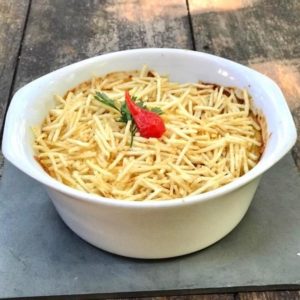 Camarão em base de arroz temperado ao molho bechamel, queijo e batata palha.