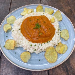 Camarão ao creme de abóbora, arroz cremoso ao gorgonzola e chips de batatas.