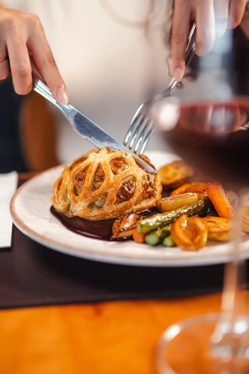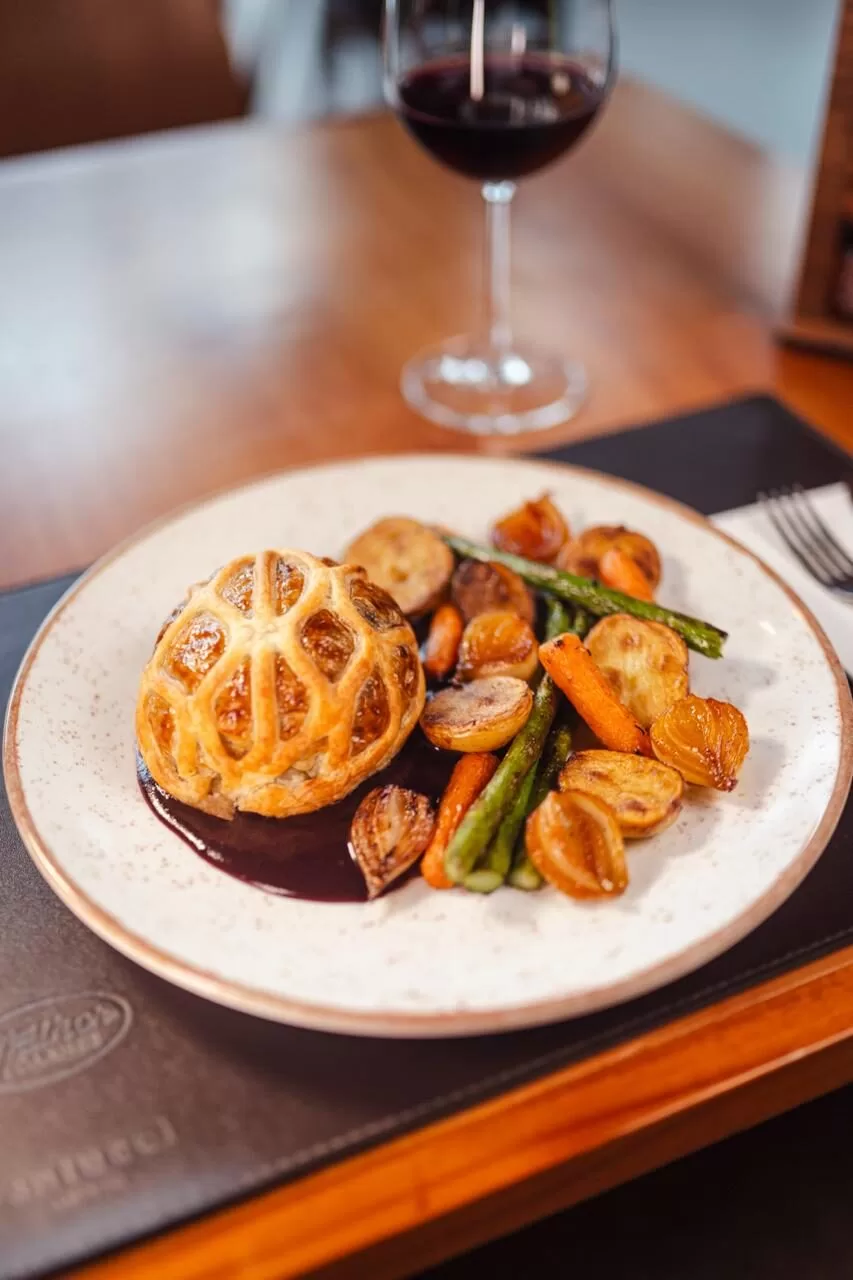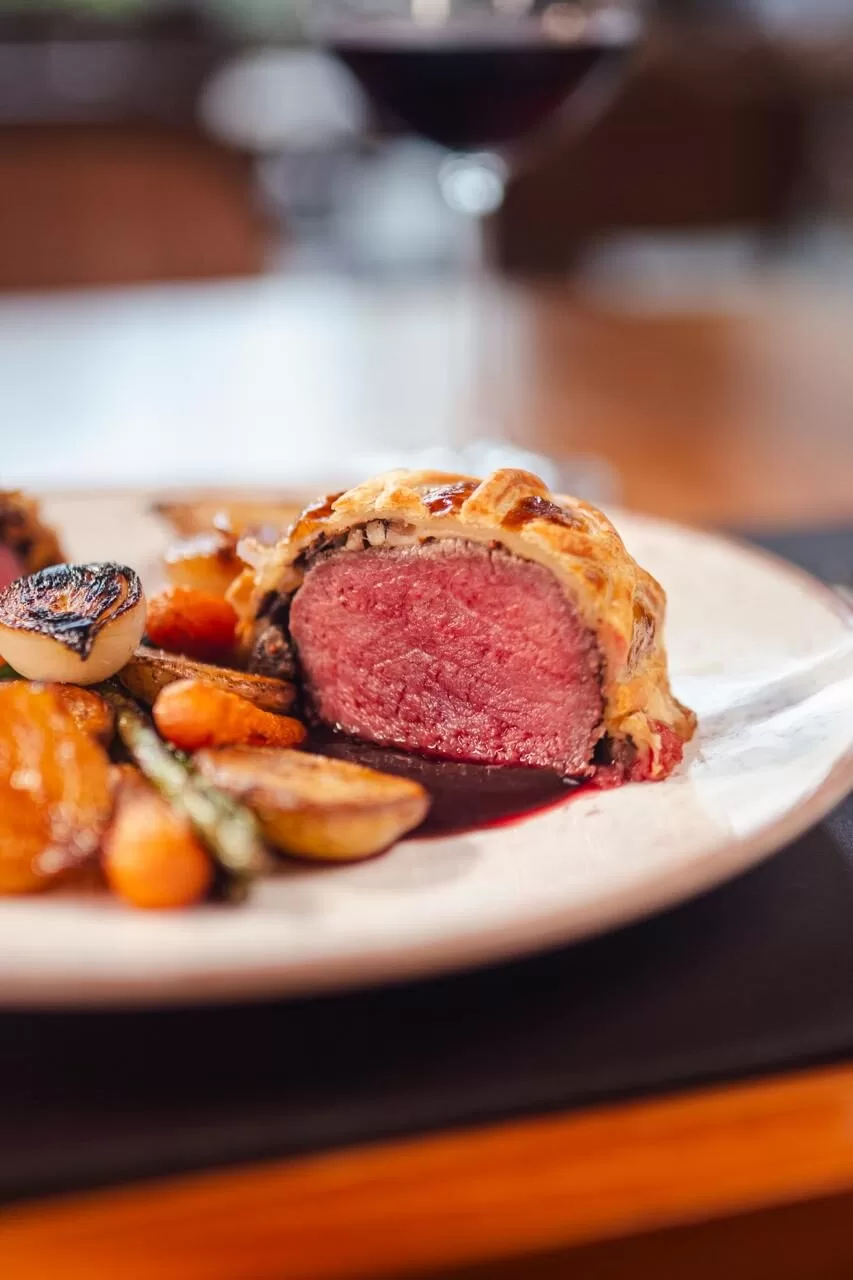 O Wellington Especial 15 Anos surge em versão ainda mais refinada, com filé mignon envolto em duxelles de cogumelos trufada e massa folhada com toque de mostardas. O prato é acompanhado por aspargos, batatas, cenouras baby e pétalas de cebola caramelizadas, finalizado com molho Malbec.